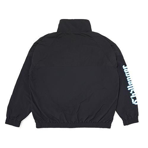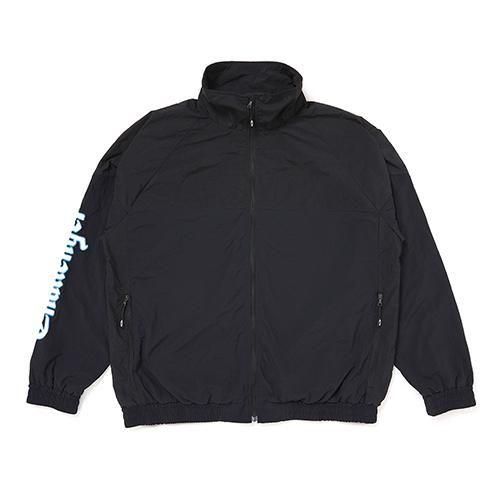 袖にロゴのプリントが入ったナイロン素材のトラックジャケットです。