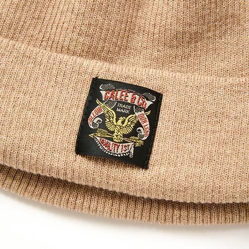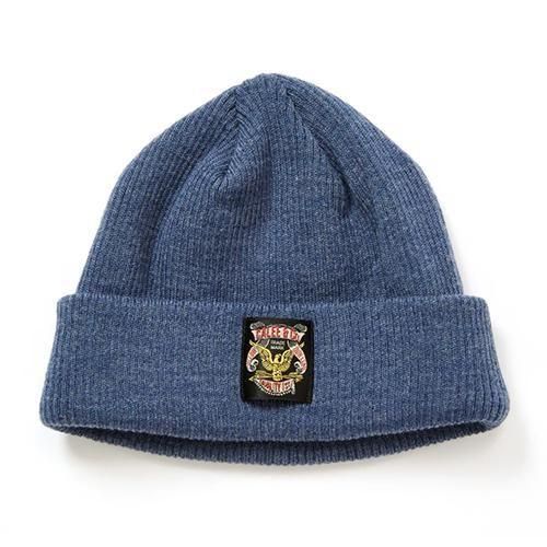 折り返し杢ニットCAP。アクリルとウールの混紡の杢糸で編み上げ、折り返しにネームが付く。