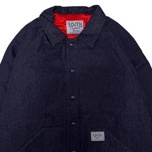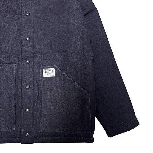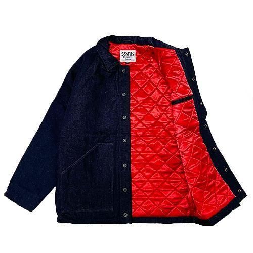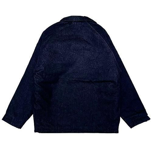 デニムのカバーオールジャケットです。裏地は中綿キルティング、袖に内リブが付いていますので、防寒性があります。