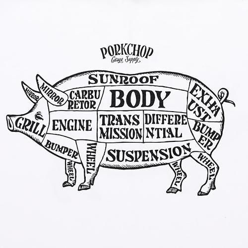 フロントにLOGO、サイドにPORKのプリントやが入ったワイドシルエットのオリジナルボディのTシャツです。