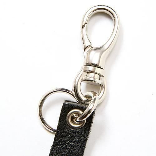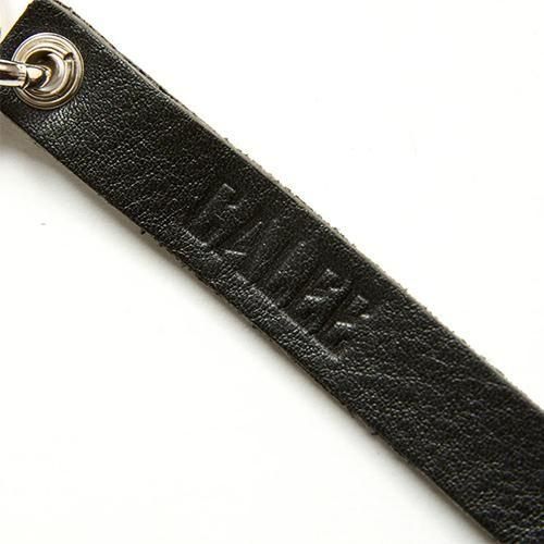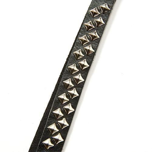スタッズレザーと編み込みレザーで作製されたショートタイプキーリング。チャームレザーにピラミッドスタッズを配した。裏側にもブランドネームの刻印が入る。BLACK / BLACK はスタッズ、ナスカンに黒メッキ加工を施した。